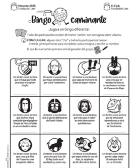 Bingo caminante. Este juego es un poquito diferente al bingo tradicional, pero es una gran manera de conocer el mundo de los personajes de literatura. Todos los participantes reciben el mismo “cartón” de bingo que, en lugar de tener números, tiene consignas sobre villanos en las historias. El juego comienza y todos los participantes al mismo tiempo caminan por el aula o por el patio con el cartón y un lápiz. Deberá consultar a todos los que se crucen para encontrar quien responda afirmativamente a cada consigna y escribir su nombre en la cuadrícula. El que llena el cartón primero será el ganador del grupo. Las consignas recorren experiencias, opiniones y puntos de vista desde la perspectiva de los lectores.