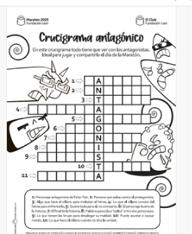 Crucigrama antagónico.Un tradicional crucigrama que pueden descargar, imprimir y repartir el día de la Maratón. Incluye consignas que invitan a recordar cuentos tradiciones, personajes entrañables y recorrer el mundo de los relatos literarios. Se puede ampliar la experiencia y proponer que los chicos y chicas creen sus propios crucigramas focalizados en temas literarios de su interés para compartir y jugar.